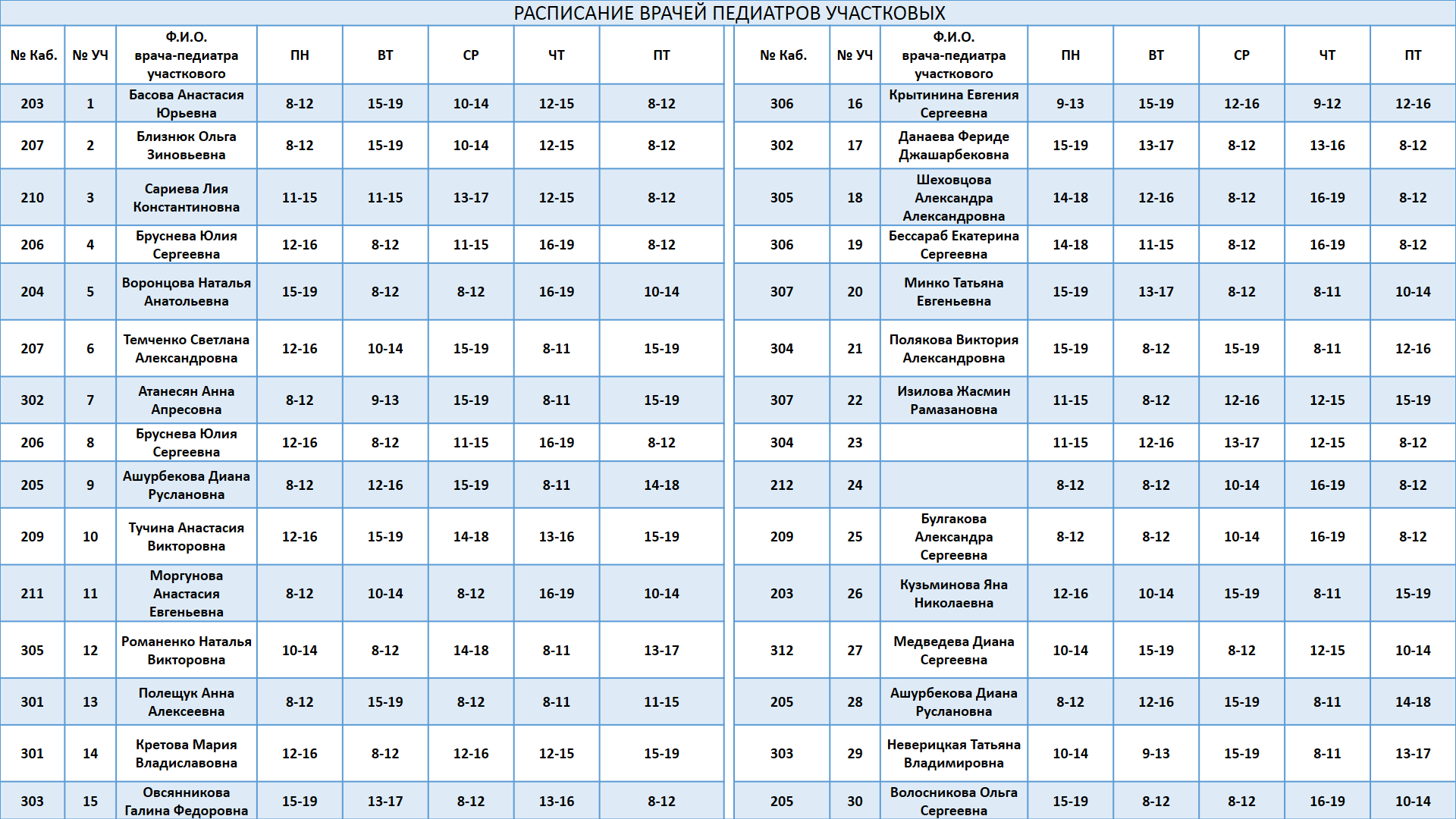 Расписание работы врачей педиатров участковых